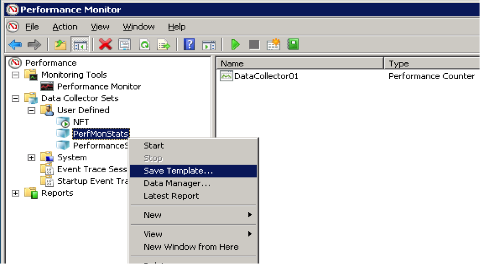 Launch Perfmon. Expand Performance tree down to your data collector set, right click on it and select Save Template. In the save dialog box that opens, give the template a name, choose a location to save it and click Save. This will create an XML file with all the details about your template. That’s it!