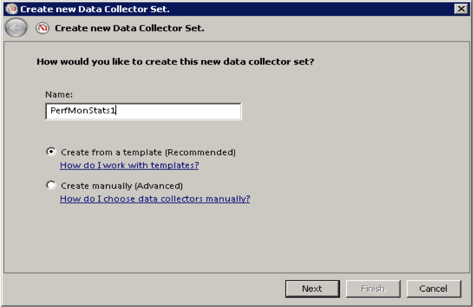 Launch Perfmon. Expand Performance tree down to User Defined, Right click on it, select New-> Data Collector Set. In the Create New dialog, name the data collector set, select Create from a template (Recommended) and click Next.